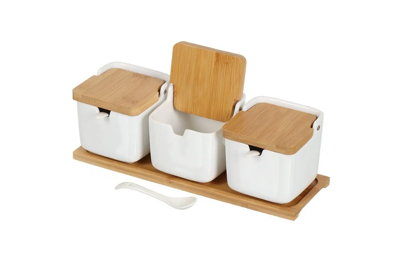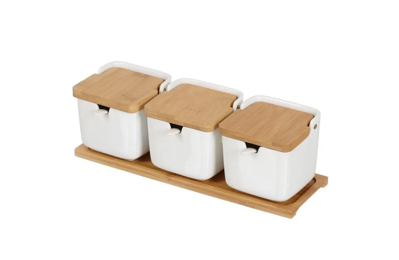 Банка для сыпучих продуктов изготовлена из высококачественной керамики и имеет вместимость 0,26 литра. В комплект входит 3 банки с крышками, что позволяет удобно хранить различные продукты, сохраняя их свежесть и аромат. В комплект входит ложка для удобного извлечения продуктов. Бамбуковая подставка обеспечивает надежную поддержку и стильное хранение банок на кухне. Этот набор идеально подходит для организации хранения сыпучих продуктов в вашей кухне, придавая ей элегантный вид и облегчая повседневные задачи.