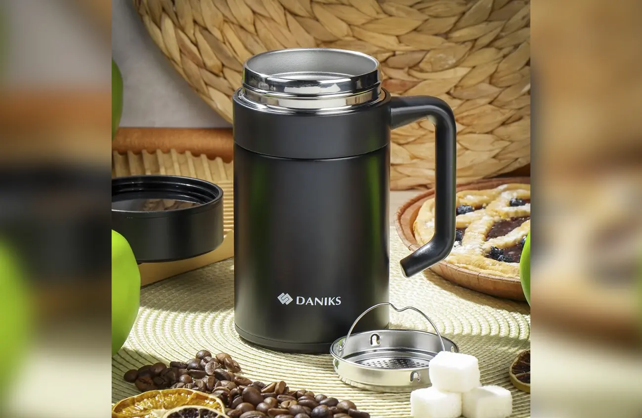 Термокружка Daniks изготовлена из высококачественной нержавеющей стали, обеспечивая надежность и долговечность использования. Ее емкость 0.4 л позволяет вам наслаждаться горячими или холодными напитками в любое время дня. Черный цвет придает кружке стильный и современный вид. Благодаря двойным стенкам, термокружка сохраняет температуру напитков на протяжении длительного времени, а удобная крышка предотвращает проливание. Эта термокружка станет отличным компаньоном в повседневной жизни и идеальным подарком для любителей горячих напитков.
