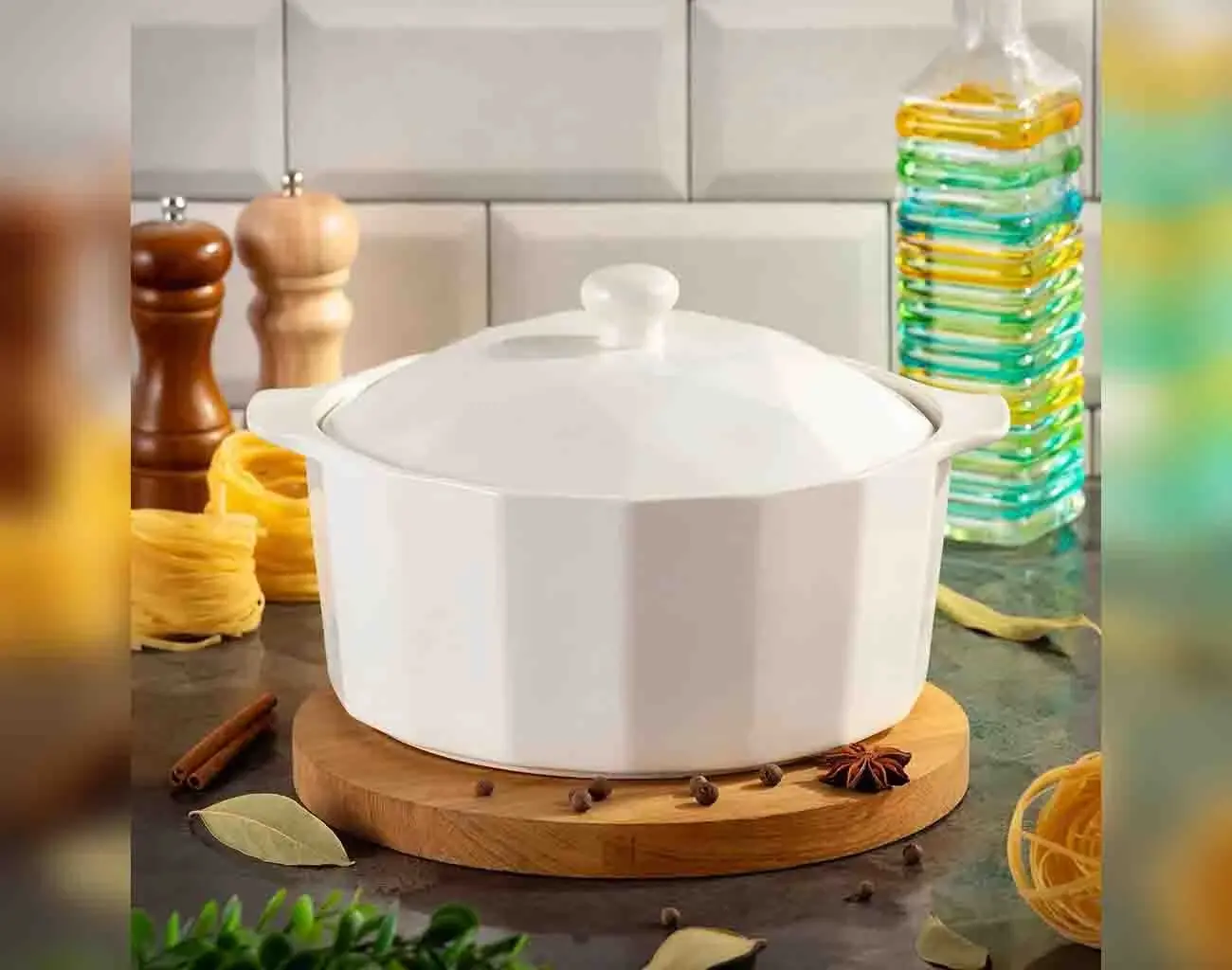 Изготовленная из керамики, эта кастрюля обеспечивает равномерное распределение тепла, что гарантирует идеальное приготовление Ваших любимых рецептов. Сильный белый цвет и гладкая поверхность придают кухне изысканный вид, а крышка надежно сохраняет тепло и ароматы, позволяя блюдам раскрыть весь свой потенциал.