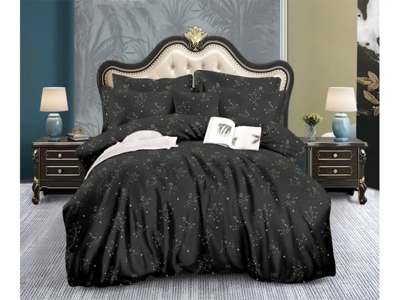 Темный фон, напоминающий бескрайнее звездное небо, подчеркивает яркие и детализированные изображения созвездий, создавая эффектный контраст, который станет изюминкой любого интерьера. Комплект изготовлен из высококачественного полисатина, который обеспечивает невероятную мягкость и отличную воздухопроницаемость, гарантируя комфортный и здоровый сон.