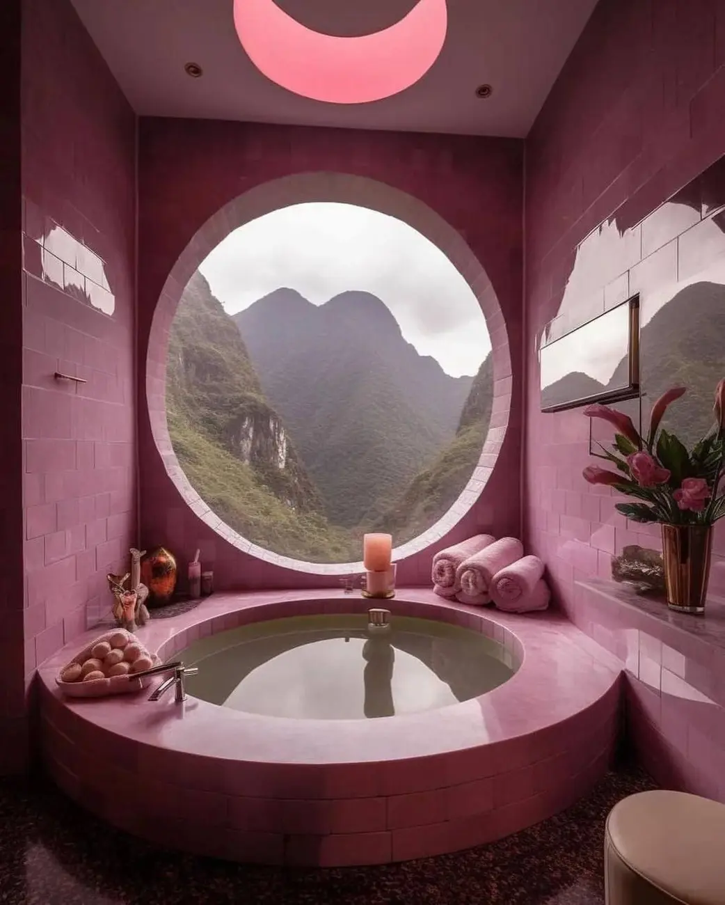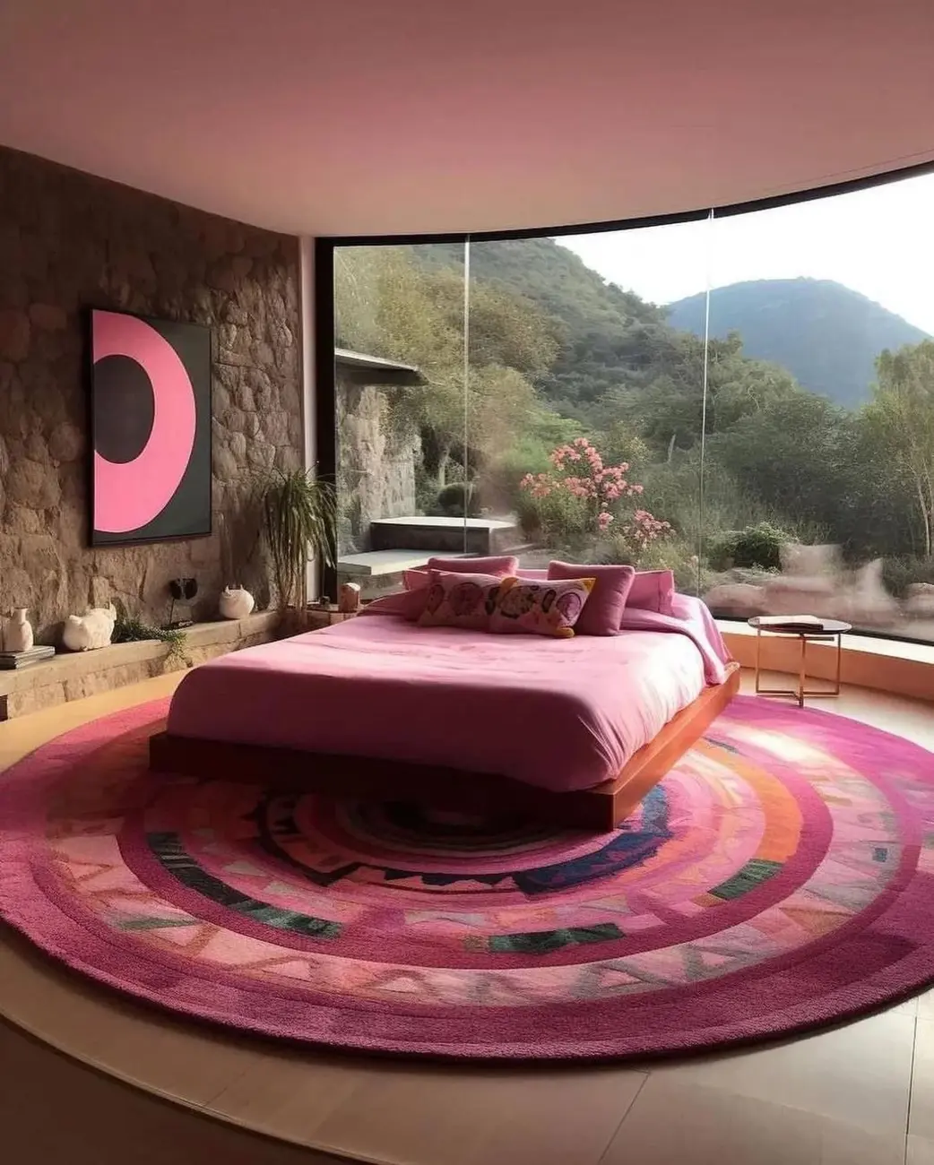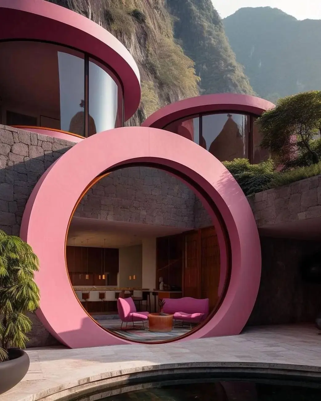 Внешность дома олицетворяет современный стиль, сочетая в себе элегантность и прогрессивность. Стены, окрашенные в нежный оттенок розового цвета, придают дому свежий и неповторимый вид. Благодаря своей круглой форме, дом выделяется среди других зданий, создавая впечатление уникальности и оригинальности.